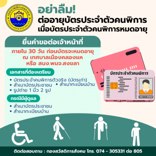 การต่ออายุบัตรประจำตัวคนพิการ เมื่อบัตรประจำตัวคนพิการหมดอายุ ยื่นคำขอต่อเจ้าหน้าที่ภายใน 30 วัน ก่อนบัตรจะหมดอายุ
