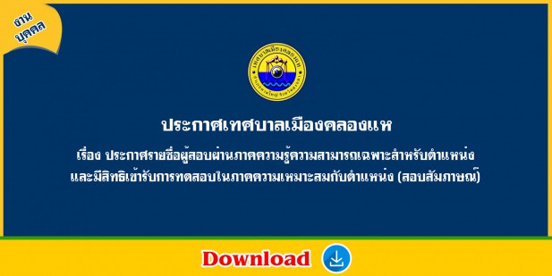 ประกาศรายชื่อผู้สอบผ่านภาคความรู้ความสามารถเฉพาะสำหรับตำแหน่ง และมีสิทธิเข้ารับการทดสอบในภาคความเหมาะสมกับตำแหน่ง (สอบสัมภาษณ์)