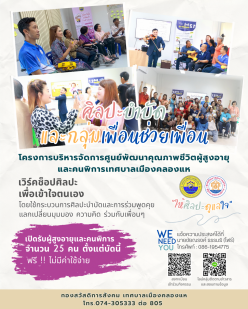 เทศบาลเมืองคลองแห เปิดรับสมัครผู้สูงอายุและคนพิการ เข้าร่วมกิจกรรม "ศิลปะบำบัด และกลุ่มเพื่อนช่วยเพื่อน (Self Help Group)" ? ภายใต้โครงการบริหารจัดการศูนย์พัฒนาคุณภาพชีวิตผู้สูงอายุและคนพิการเทศบาลเมืองคลองแห