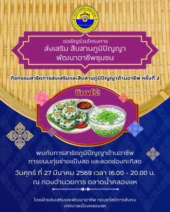 ขอเชิญทุกท่านร่วมงานกิจกรรมสาธิตการส่งเสริมและสืบสานภูมิปัญญาด้านอาชีพ ครั้งที่ 2 พบกับการทำเมนูยอดฮิต "กุยช่ายแป้งสด" และ "ลอดช่องกะทิสด" แบบต้นตำรับ
