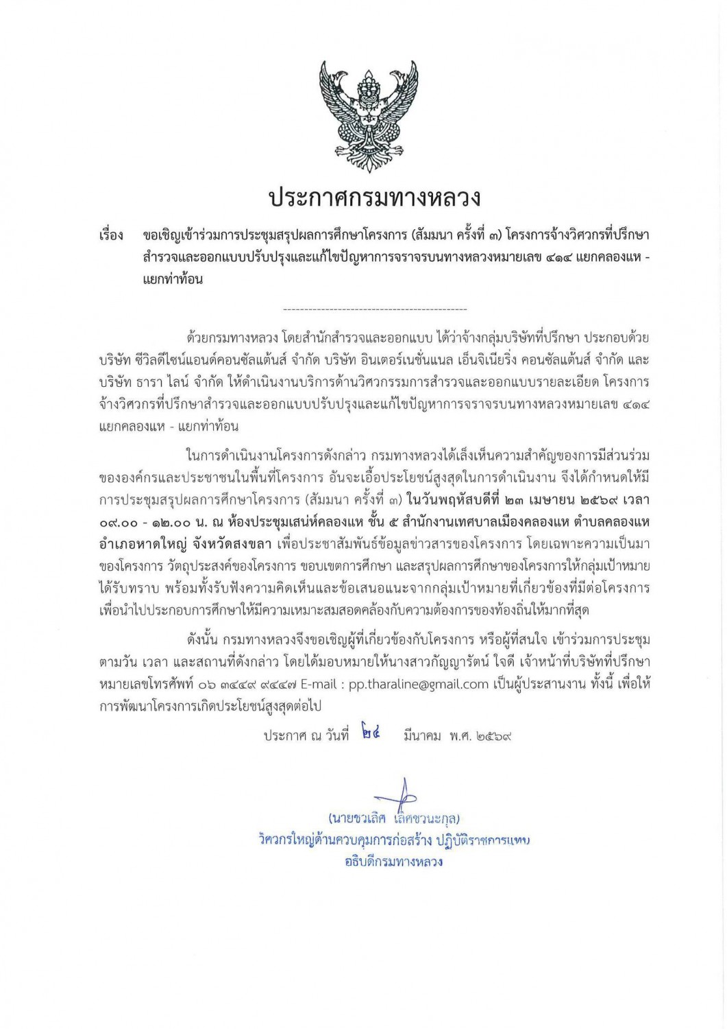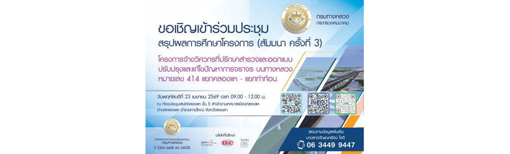 กรมทางหลวง ขอเชิญชวนผู้ที่สนใจและผู้ได้รับผลกระทบ เข้าร่วมรับฟังและแสดงความคิดเห็นในโครงการจ้างวิศวกรที่ปรึกษาสำรวจและออกแบบ ปรับปรุงและแก้ไขปัญหาการจราจร บนทางหลวงหมายเลข 414 ช่วงแยกคลองแห - แยกท่าท้อน