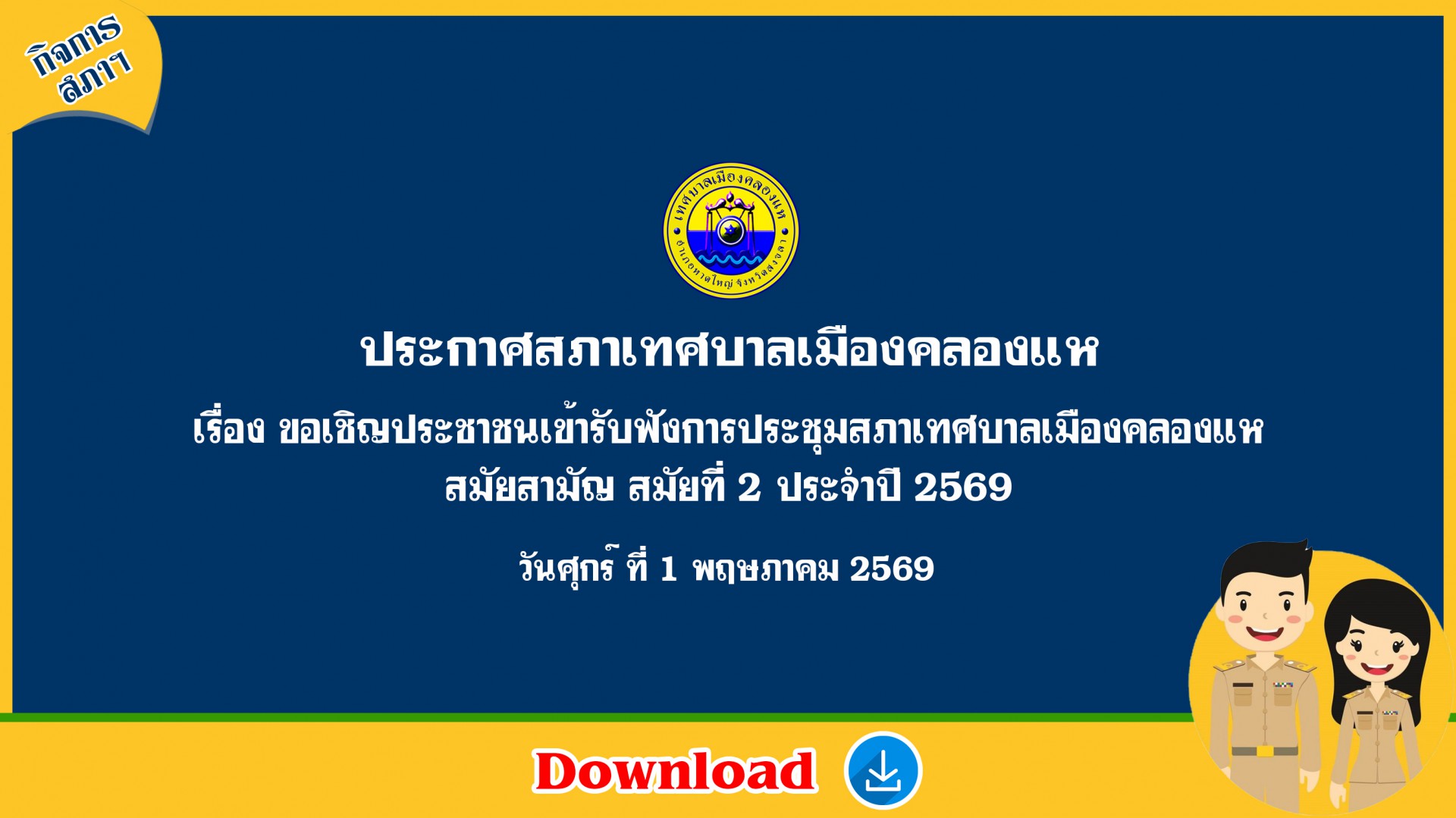 ขอเชิญประชาชนเข้ารับฟังการประชุมสภาเทศบาลเมืองคลองแห สมัยสามัญ สมัยที่ 2 ประจำปี 2569